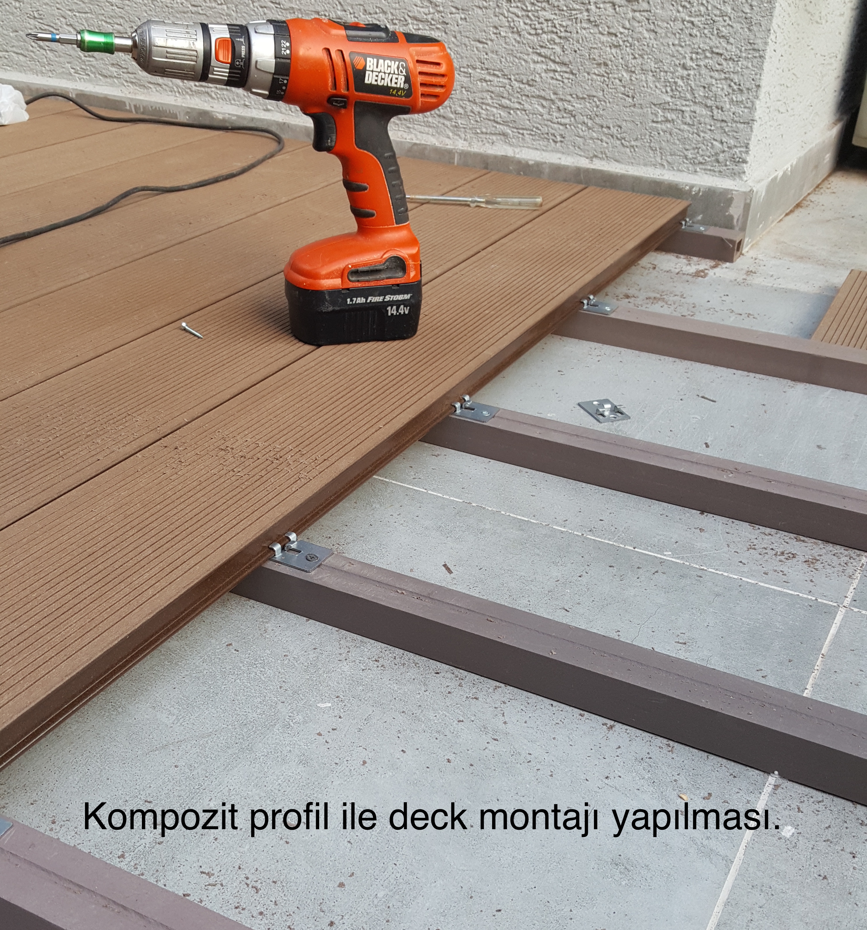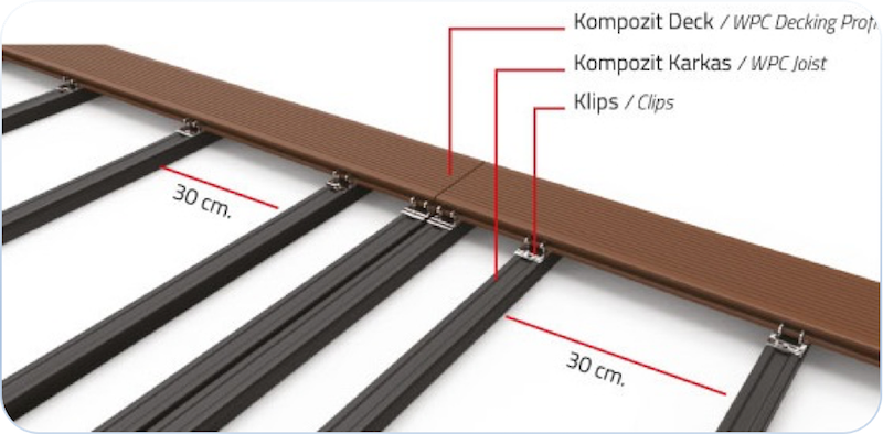 TERAZİSİ DÜZGÜN SERT ZEMİNLERDE UYGULAMA : Terazisi düzgün sert zeminlerde (Seramik, mermer vs. kaplı zeminler ya da şapı düzgün atılmış beton zeminlerde) kompozit profil ile karkas yapılarak decklerin kaplaması yapılabilmektedir. Kompozit profiller, aşağıda verilen montaj şemasındaki ölçülere uygun şekilde, standart aralıklar ile decklerin kesiştiği kısımlarda çift kayıt sistemine dikkat edilerek, buldeks vidalar ile veya yapıştırıcılar ile zemine sabitlendirilmesi gerekir. Alt yapı kompozit karkas sistemi tamamlanmasından sonra metal klipsler ile bağlantı yapılmak üzere kompozit decklerin kaplaması karkas sistemi üzerine yapılmaktadır.